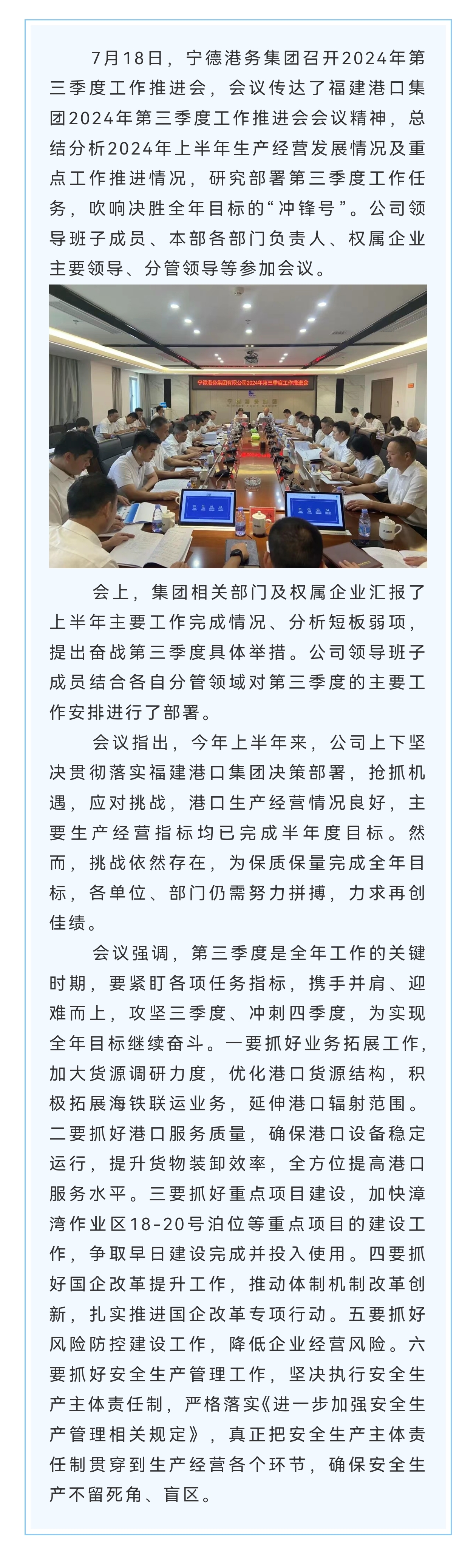 秉承“团结、爱港、务实、发展”的理念,全力推进漳湾作业区码头泊位连片开发,不断完善公司治理体系,深化体制机制改革,聚焦主责主业发展实体经济,推动产业转型升级,打造区域港口龙头企业,成为宁德市建设公共码头、助力工业及经济发展的平台及抓手,推动地方经济高质量发展超越。