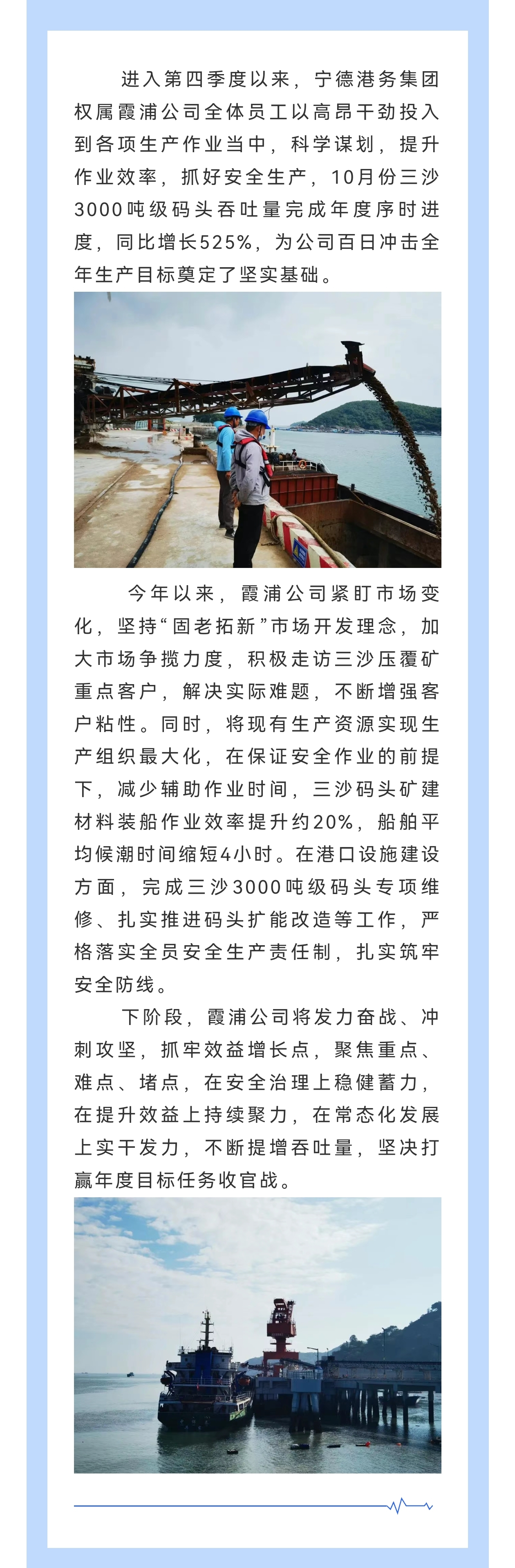 秉承“团结、爱港、务实、发展”的理念,全力推进漳湾作业区码头泊位连片开发,不断完善公司治理体系,深化体制机制改革,聚焦主责主业发展实体经济,推动产业转型升级,打造区域港口龙头企业,成为宁德市建设公共码头、助力工业及经济发展的平台及抓手,推动地方经济高质量发展超越。