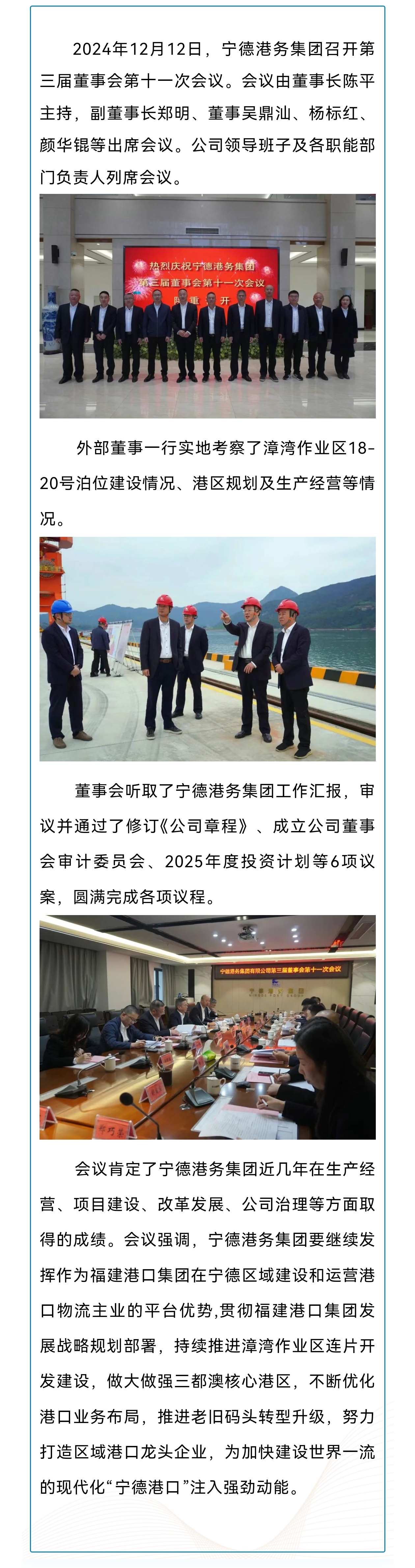 秉承“团结、爱港、务实、发展”的理念,全力推进漳湾作业区码头泊位连片开发,不断完善公司治理体系,深化体制机制改革,聚焦主责主业发展实体经济,推动产业转型升级,打造区域港口龙头企业,成为宁德市建设公共码头、助力工业及经济发展的平台及抓手,推动地方经济高质量发展超越。