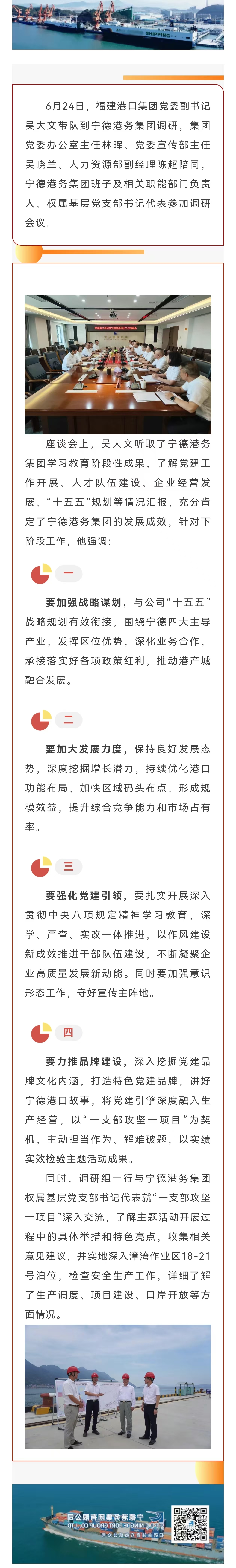 秉承“团结、爱港、务实、发展”的理念,全力推进漳湾作业区码头泊位连片开发,不断完善公司治理体系,深化体制机制改革,聚焦主责主业发展实体经济,推动产业转型升级,打造区域港口龙头企业,成为宁德市建设公共码头、助力工业及经济发展的平台及抓手,推动地方经济高质量发展超越。