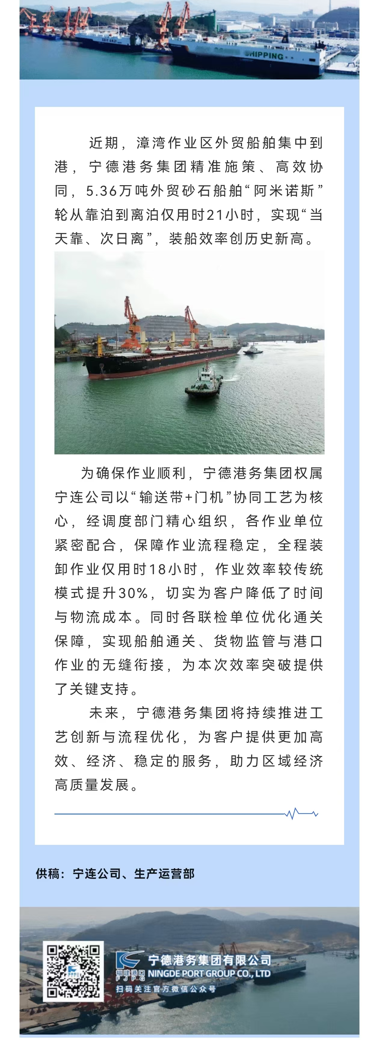 秉承“团结、爱港、务实、发展”的理念,全力推进漳湾作业区码头泊位连片开发,不断完善公司治理体系,深化体制机制改革,聚焦主责主业发展实体经济,推动产业转型升级,打造区域港口龙头企业,成为宁德市建设公共码头、助力工业及经济发展的平台及抓手,推动地方经济高质量发展超越。